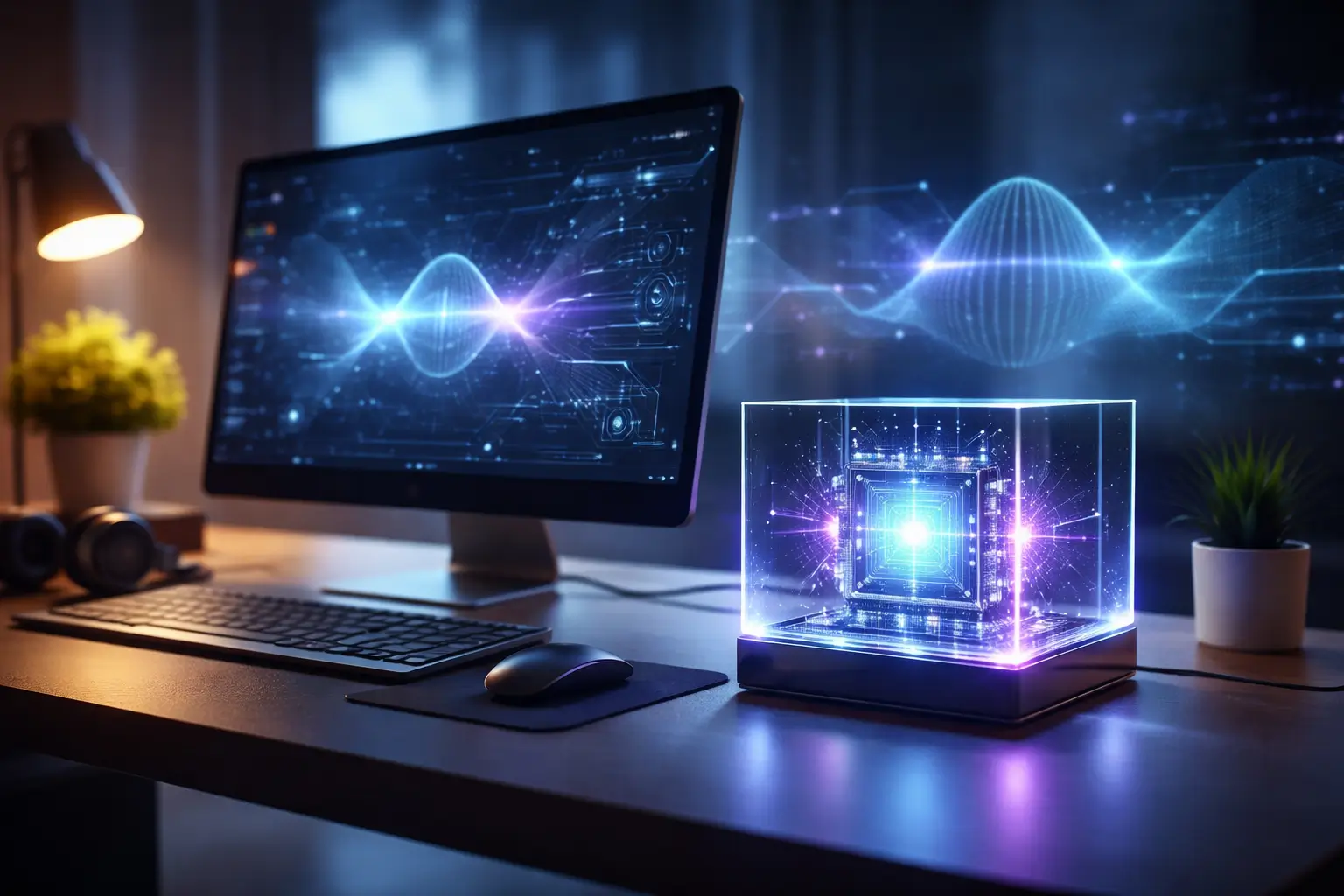 A futuristic home office setup featuring a transparent quantum processing unit and holographic data streams on a desk.