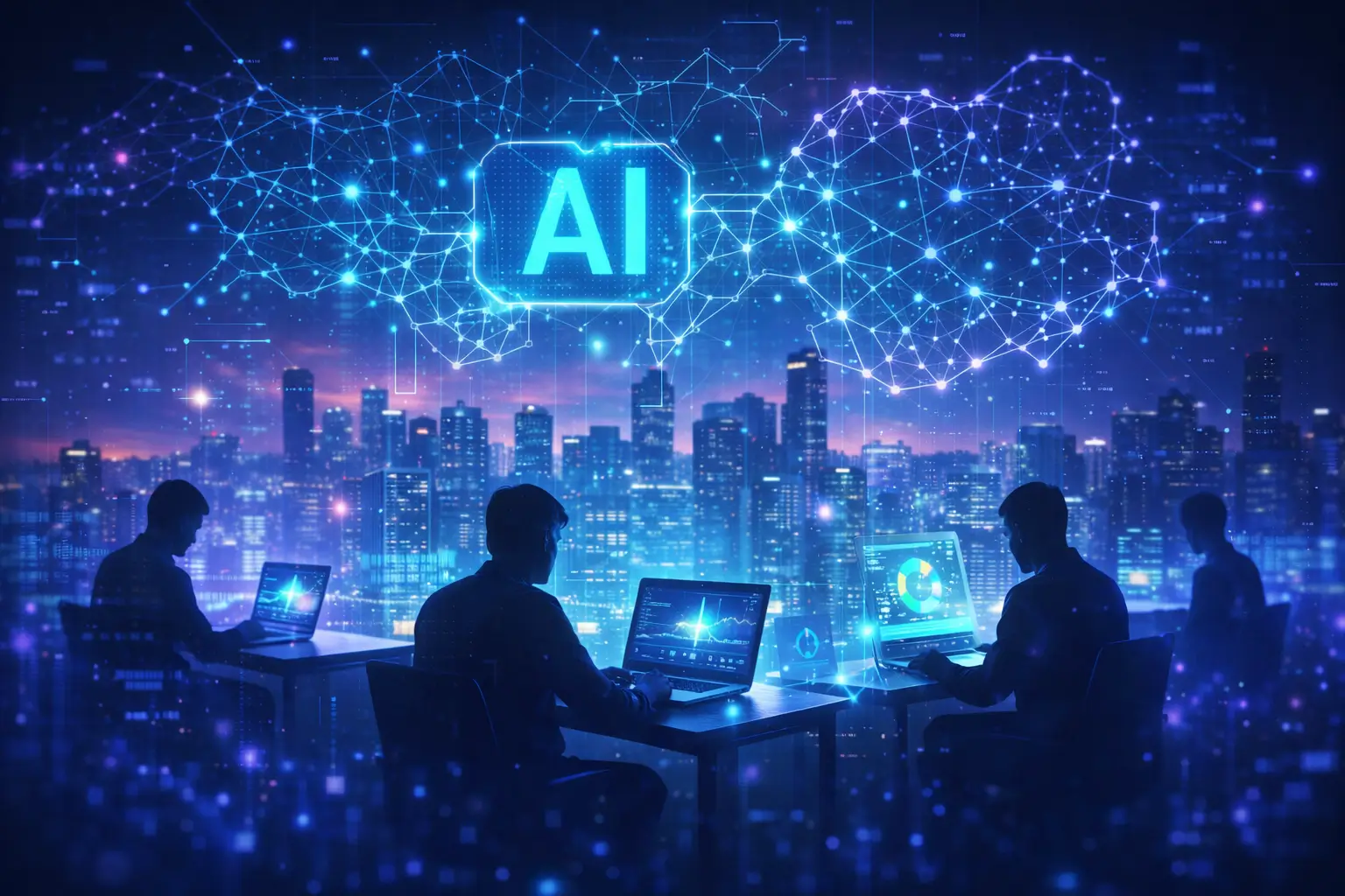 Professional workspace with tablet showing digital human brain and global data nodes representing ghost work economy in 2026