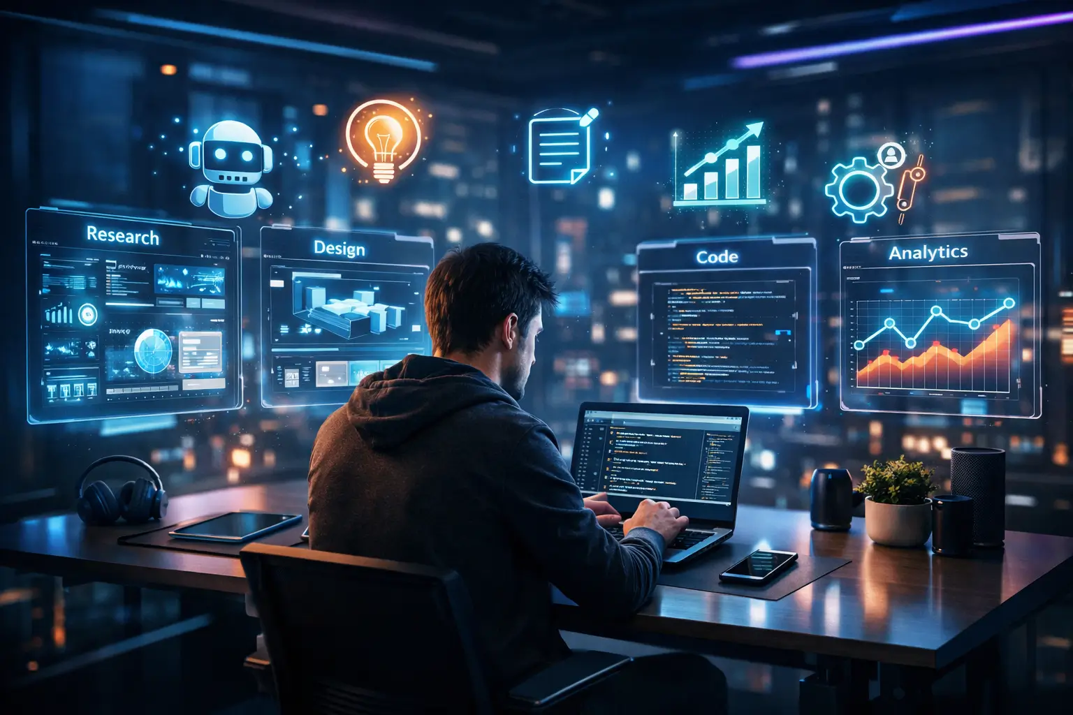 A freelancer working on a laptop with futuristic holographic screens showing AI interfaces for Research, Design, Code, and Analytics in a 2026 home office setting.